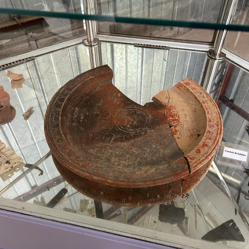 Museum artifacts: on the left part of a painted plate; on the right excavated columns and statues, etc....