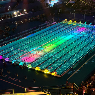 Women's 400m Medley - two heats with a total of 16 swimmers. The 8 fastest times went on to the finals. Finals were held this evening (we watched it on TV) where WR McIntosh from Canada did not break her WR, but she won Gold. Two USA swimmers - Grimes and Weyant won Silver and Bronze respectively.